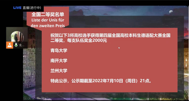 (通讯员 刘冠龙) 2022年7月10日,由北京外国语大学德语学院、中德人文交流研究中心主办的第四届全国高校本科生德语配音大赛在线上举行。该项赛事是全国德语界的传统重要赛事之一,该项赛事分为初赛和决赛。初赛在今年4月17日举办,有全国的55支高校代表队伍参加,在线上进行了视频的播放和评分。德语系2019级的陶郁、朱静怡、刘卓欣和欧领四位同学代表永利官网德语系出战,经过激烈的角逐,大赛共评选出包括永利官网德语系的共15支参赛队伍晋级决赛。