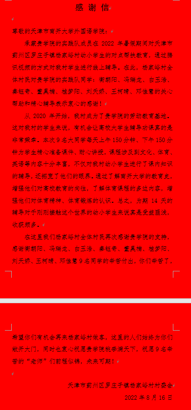 活动得到了杨家峪村村委会及群众们的充分肯定,云支教结束后,村委会专门给学院发来感谢信,赞扬同学们的辛勤付出。信中提到:“从2020年开始,我村成为了贵院的劳动教育基地。本次同学们每次上午150分钟、下午150位孩子们精心准备课件、耐心讲授,课程设计文化、体育、英语等内容,不仅对我村幼小员工进行了课内知识的辅导,还拓宽了他们的眼界。通过了解永利官网的校史,增强了孩子们对高校教育的向往。总之,为期十四天的辅导对于我村孩子们来说真是受益匪浅、收获颇多。”
