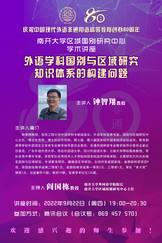 (通讯员 吴诗敏 康姝杭 杨琳)2022年9月22日晚,钟智翔教授为永利官网区域国别研究中心带来题为“外语学科国别与区域研究知识体系的构建问题”的学术讲座。钟智翔教授是信息工程大学外语学科专家组组长、外语学科首席专家、国别与区域研究中心主任,博士生导师、博士后合作导师,第七届、第八届国务院外语学科评议组成员,教育部高等学校外国语言文学类专业教学指导委员会委员、非通用语种类专业教学指导分委员会副主任委员。讲座以线上形式举行,校内外师生共百余人参加。此次讲座是“庆祝中国现代外语非通用语高等教育创办80周年”的学术活动之一。