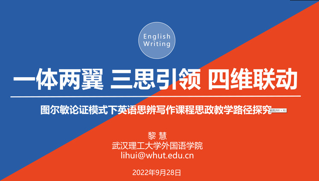 第二位主讲人黎慧教授的报告题目为“图尔敏论证模式下英语思辨写作课程思政教学路径探究”。黎教授依据学情分析和英语思辨写作教学中存在的痛点,探索并提出了“一体两翼、三思引领、四维联动”的教学理念,并基于此创新教学模式、教学过程和方法以及考评体系,切实解决了教学中的痛点,促进了课程建设和人才培养。黎教授提出将图尔敏论证模式引入“课程思政”元素学习中,既提升员工写作和思辨能力,又帮助员工树立积极健康的价值观。