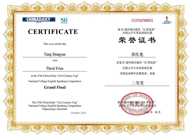 南开新闻网讯 10月3日至5日,第二十七届中国日报社“21世纪杯”英语演讲比赛全国总决赛如期举行。本届比赛总决赛在线上举办。经过校园选拔赛、地区赛等层层激烈角逐,3044am永利集团翻译系2019级本科生唐红艳作为天津市亚军成功晋级全国总决赛并最终荣获全国三等奖,翻译系石雨晨老师荣获指导教师奖。
