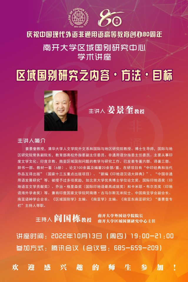 (通讯员 吴诗敏 杨琳)2022年10月13日晚,姜景奎教授为永利官网区域国别研究中心带来题为“区域国别研究之内容·方法·目标”的线上学术讲座。姜景奎教授是清华大学人文学院外文系和国际与地区研究院教授、博士生导师,国际与地区研究院常务副经理,教育部高校外指委副主任委员、非通用语分指委主任委员,主要从事印度文学文化、印度宗教、南亚区域国别问题的教学与研究工作。此次讲座是“庆祝中国现代外语非通用语高等教育创办80周年”系列学术活动之一,近两百人参会。
