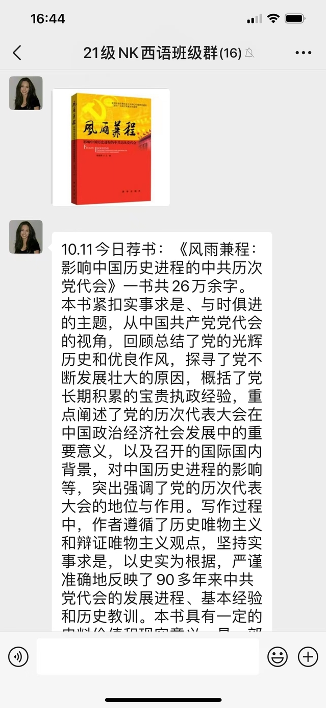 辅导员周文钰老师与硕士研究生共读《感悟党史》,他们表示,作为青年党员,要紧密团结在党中央周围,不忘初心、牢记使命,坚定不移听党话、跟党走,怀抱梦想又脚踏实地,敢想敢为又善作善成,做有理想、敢担当、能吃苦、肯奋斗的新时代好青年,让青春在全面建设社会主义现代化国家的火热实践中绽放绚丽之花!管理干部徐晶老师与助管员工一起学习《中国共产党历史》,她谈到,员工的学习热情很高涨,中国共产党在革命中经受住了考验,彰显了最鲜明的品格,员工在学习后更加坚定了艰苦奋斗的精神,坚决最好共产主义事业的接班人。2021级西班牙语专业陈镜雯同学与班导师共读《火种:寻找中国复兴之路》,书中以“寻找中国复兴之路”为切入口,通过大量的细节描写解密红色火种如何在沉沉黑夜成功燎原,讲述了党的创业之艰难与革命新航程的来之不易及其伟大成就。