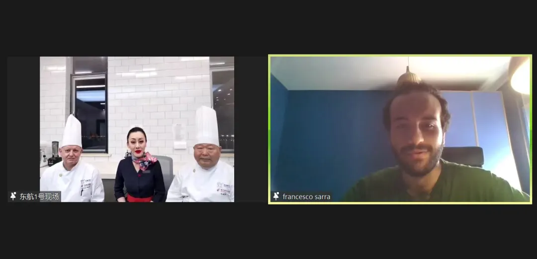 活动中,中意高校师生就两国饮食文化展开了形式多样的分享和讨论。东航罗马营业部员工马慧心(Martina Franceschini)和永利官网意大利语系员工郑宇豪分享了对中式早茶与西式下午茶的理解和感受。罗马大学汉语系的三位员工介绍了家乡的特色美食。东航行政主厨路德维希(Ludwig Strobel)、高级点心师傅马庭堂与曾留学旅居意大利的乘务长胡安伦为员工们揭秘东航航食的健康与文化理念,“云”上品尝“东航那碗面”和“东航那杯茶”。