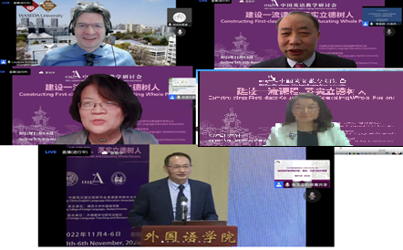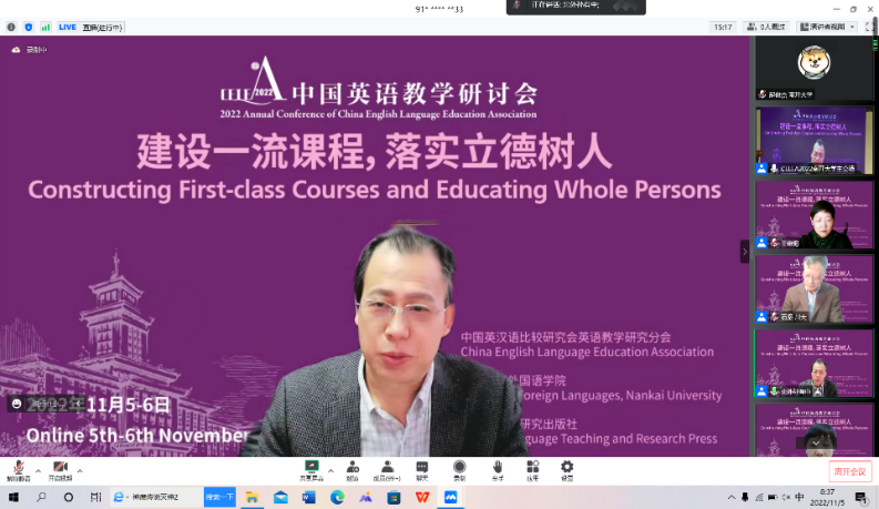 11月5日上午和6日下午,早稻田大学Laurence Anthony教授、大连外国语大学常俊跃教授、北京外国语大学张莲教授、广东外语外贸大学张欣教授、永利官网张文忠教授接受组委会邀请,分别就专门用途英语课程与教学设计、从外语技能导向培训到内容语言融合教育的理念变革和实践反思、应用语言学知识体系创新发展的成就与问题、国际传播效能提升视域下的《理解当代中国》英语系列教材课堂实践探索和虚拟教研室课程共建的理念内容与研究展望做了五场主旨报告。其中,Laurence Anthony教授还特别介绍了由外研社2022年7月新出版的《专门用途英语导论》(Introducing English for Specific Purposes)。据不完全统计,5场主旨报告吸引了全国16000余位同仁线上收看。