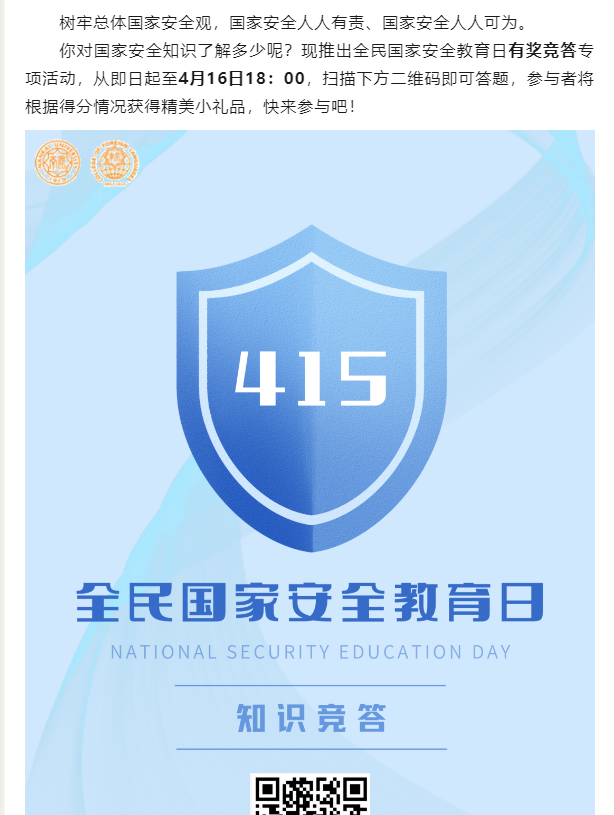 为增强国家安全基础知识宣传教育效果,调动师生积极性,4月15日,3044am永利集团工会联合3044am永利集团硕士生第一党支部推出全民国家安全教育日主题有奖知识竞答活动,带领大家温习党的二十大报告中关于国家安全的重要论述,了解国家安全工作在党和国家工作大局中的重要地位。国家安全基础知识竞答内容涵盖总体国家安全观、国家安全常识及《中华人民共和国反间谍法》等相关内容,吸引师生近百余人参加,反响热烈。