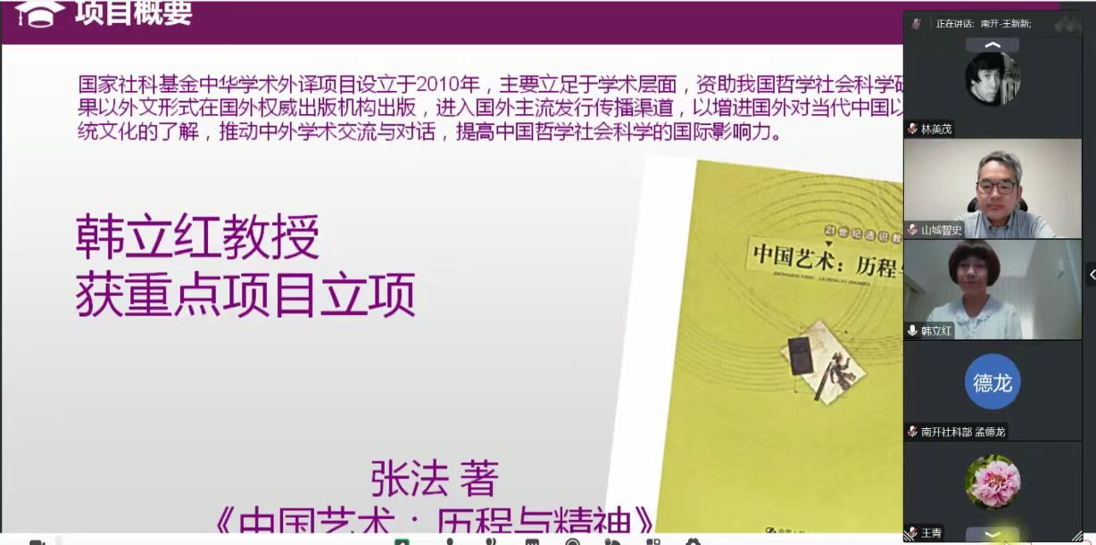 (通讯员 韩立红)2023717日,2022-2023年度国家社科基金中华学术外译重点项目《中国艺术》(张法著)开题报告会在线上举行。该项目(日文版)由3044am永利集团日语系主任韩立红教授与中国人民大学出版社联合申报,韩立红教授为项目主持人。