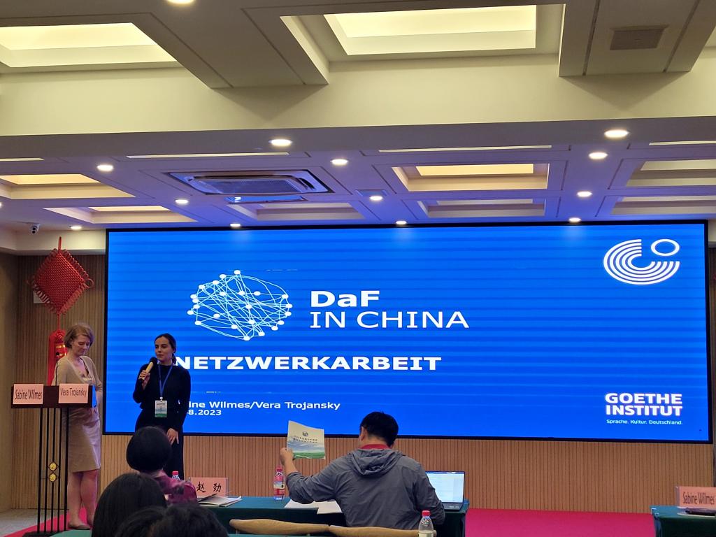本次大会上,歌德学院(中国)和各出版社代表也向与会教师介绍了各自单位的工作情况。魏冰娜及德语教学合作处主任杨佳芝(Vera Trojansky)在回顾上一年工作和成果的基础上,介绍了歌德学院(中国)2023-2024年度的工作安排及其对德语教师线上、线下教学法培训重点