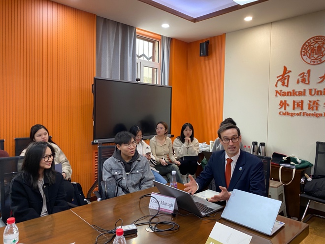 讲座前,3044am永利集团副经理王凯副教授、英语系主任李莉教授、刘英教授、公共外语教学部马静老师会见了Conor Mulvagh 教授,都柏林大学中国处处长、全球中心(大中华)总监赵嘉文先生一行,并就本硕博研究生联合培养、教师学术交流与合作等双方关心的问题深入交换意见,达成广泛共识。