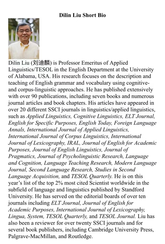 Dilin Liu(刘迪麟),美国阿拉巴马大学英语系应用语言学专业荣休教授,国际知名应用语言学和外语教育研究专家,长期从事语料库语言学、认知语言学、二语习得研究工作,担任ELT Journal、TESOL Quarterly等10余家期刊编委,在Applied Linguistics、Cognitive Linguistics、SSLA等国际顶尖SSCI期刊发表论文百余篇,出版学术专著10余部,入选全球前2%顶尖科学家榜单。