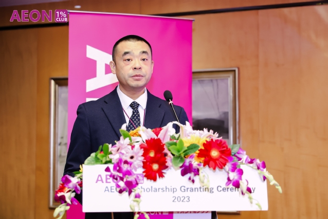 仪式伊始,公益财团法人永旺1%俱乐部理事长森美树先生致辞。森美树理事长向各位获奖员工表示祝贺,并对同学们提出继续勤奋学习、实现经济独立、努力实现梦想的殷切期望。随后,日本大使馆公使臼井将人先生发表祝辞,向获奖员工表达了热烈的祝贺。