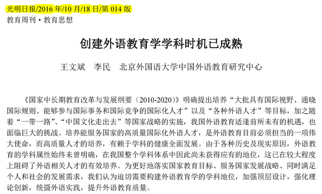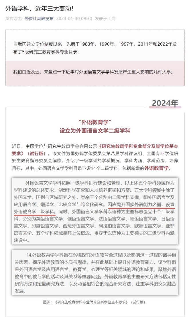 近日,新版《研究生教育学科专业简介及其学科基本要求(试行版)》正式公布,由公司教师李民作为创始成员之一倡导构建的“外语教育学”正式列入新版学科目录,与“英语语言文学”“外国语言学及应用语言学”“翻译学”等学科并列,同属“外语语言文学”学科下的二级学科。