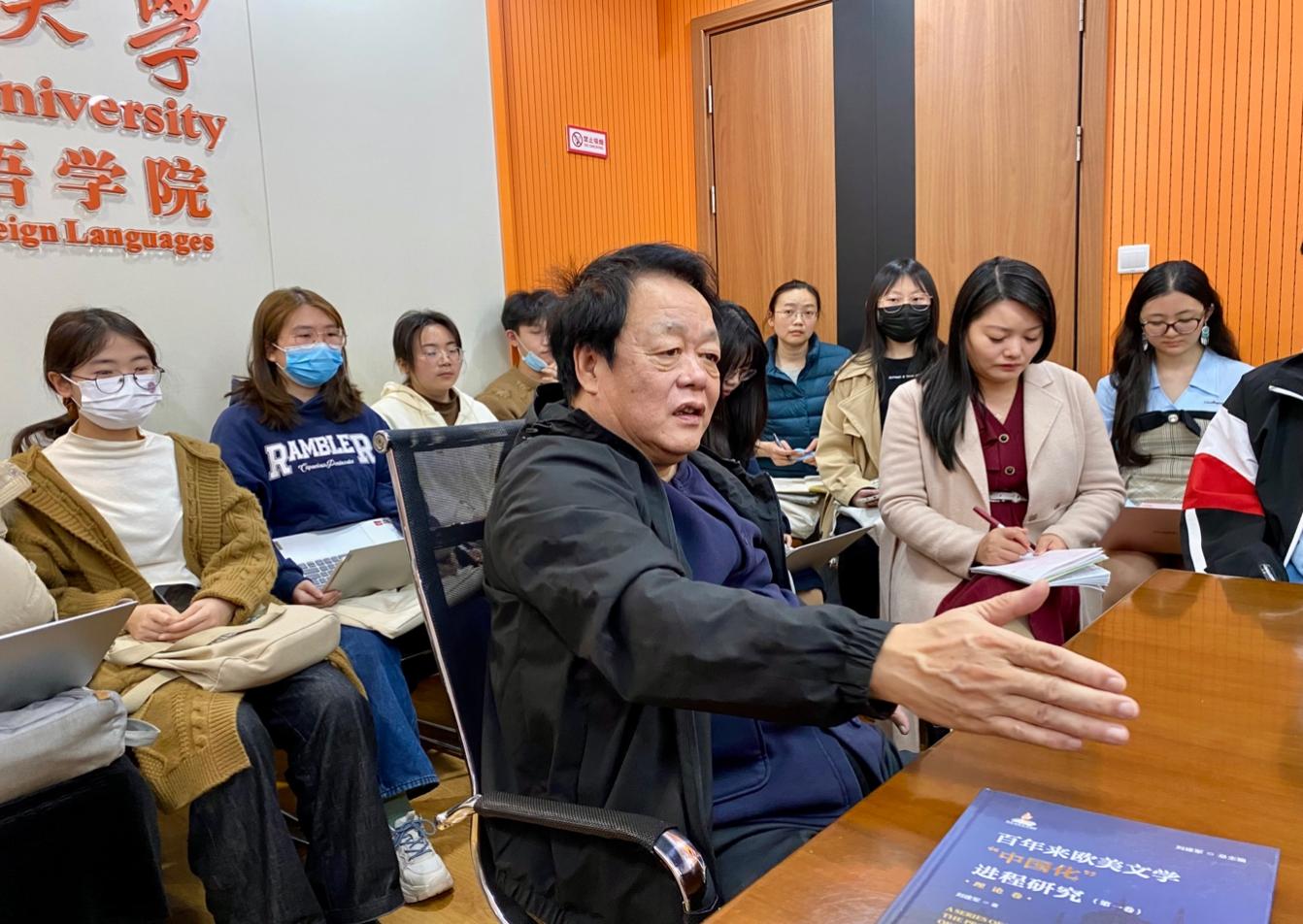 刘建军教授从何为科研、如何科研等两大方面以及“问题意识”、“文学作品阅读”和“概念创新”三点向师生们做了精彩讲座。首先,刘建军教授指出“消遣式阅读”、“欣赏式阅读”和“学术性阅读”的区别,认为“学术性阅读”的主要任务是“提出问题和解决问题”。他强调,选题的关键就是提出有效的问题,我们要从国家战略需要出发提出有价值的问题,勿当西方话语的传声筒。然后,刘建军教授基于《哈姆雷特》《老人与海》《红与黑》《浮士德》等外国文学经典作品,具体阐述如何在阅读时透过文本细节看到背后的本质。他指出,无论是阅读还是讲授,我们都要做到与时俱进,根据时代的需求与主题,发现经典文本的新意,讲出符合社会发展规律的道理,才能真正创新。最后,刘建军教授讲述了如何对概念进行创新性阐释。刘建军教授博学多识、学贯中西,对中外经典信手拈来、如数家珍,他的讲解由浅入深、风趣幽默、新解新见频出,不时博得大家的阵阵掌声。