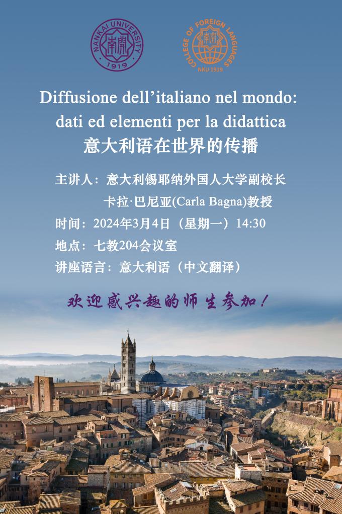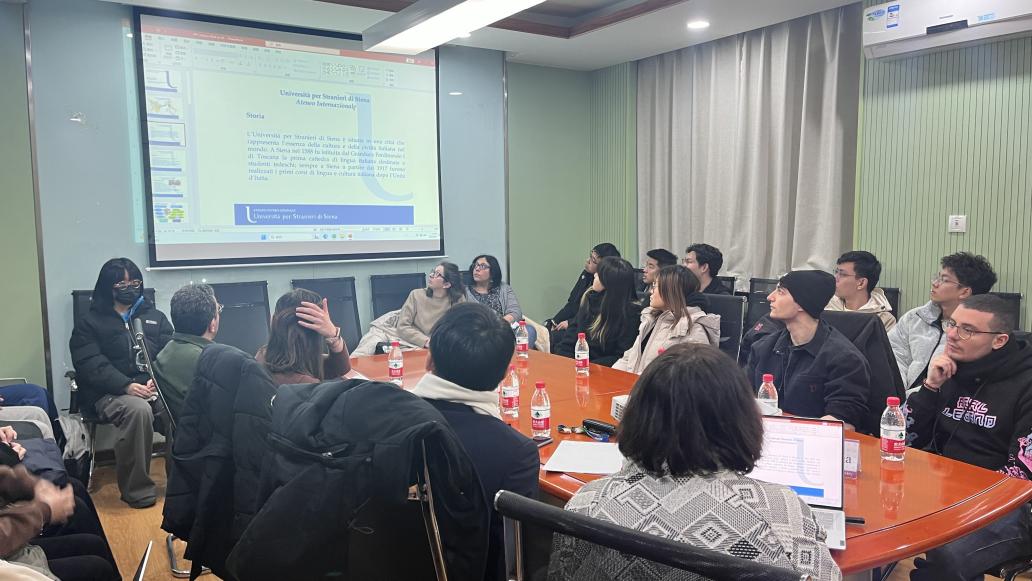 会见结束后,卡拉·巴尼亚教授做了一场题为《意大利语在世界的传播》的学术讲座。参加讲座的有3044am永利集团意大利语系师生以及汉语言文化学院的意大利职工。卡拉·巴尼亚教授首先简单介绍了锡耶纳外国人大学的办学理念、专业设置和团队配备等。随后,卡拉·巴尼亚教授从语言景观的视角介绍了当今意大利语在世界的传播,鼓励同学们学好意大利语,同时欢迎大家前往锡耶纳外国人大学交换学习。