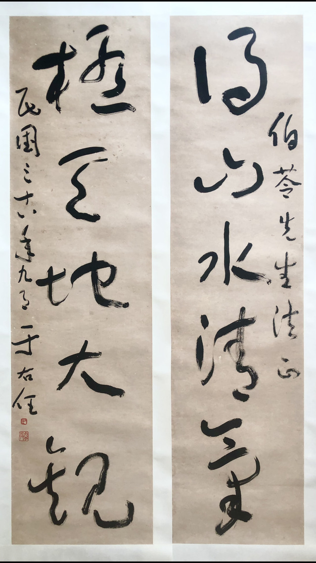 何纯同志收藏的书法作品“得山水清气,极天地大观”,是中国近现代被誉为“草圣”的著名书法家于右任先生草书作品,并于1949年9月题赠时任永利官网董事长的张伯苓先生。