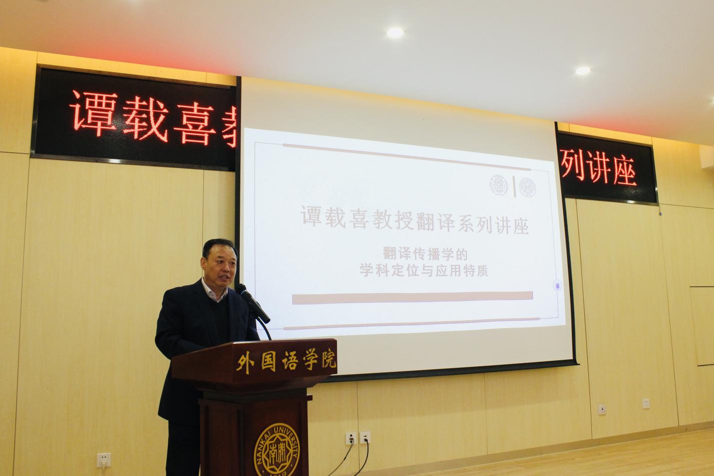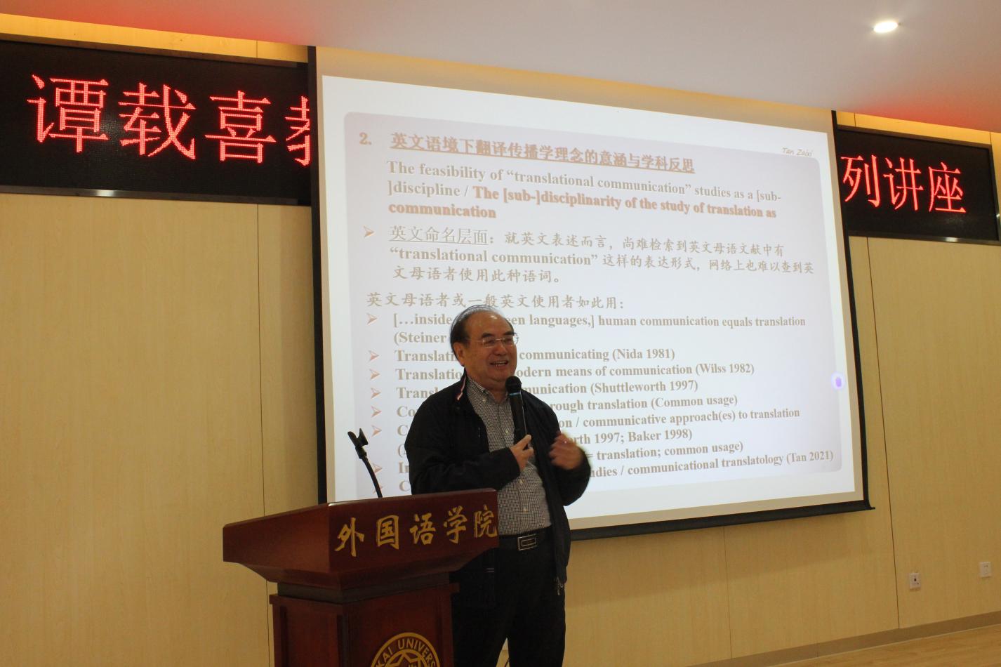 (通讯员 常远 林菁菁 彭倩)2024年4月9日至10日,应3044am永利集团邀请,曾任深圳大学特聘教授和北京外国语大学讲座教授的香港浸会大学荣休教授、深圳大学3044am永利集团名誉教授、博士生导师谭载喜教授,为全院员工带来两场翻译系列讲座。3044am永利集团经理阎国栋、翻译系系主任张智中教授、翻译系教授胡翠娥、英语系荣休教授苗菊,翻译系副教授张强等出席了讲座。两次讲座除面向本院师生外,还吸引了来自北京外国语大学、天津师范大学、天津外国语大学等其他院校的老师及本硕博同学前来参加。