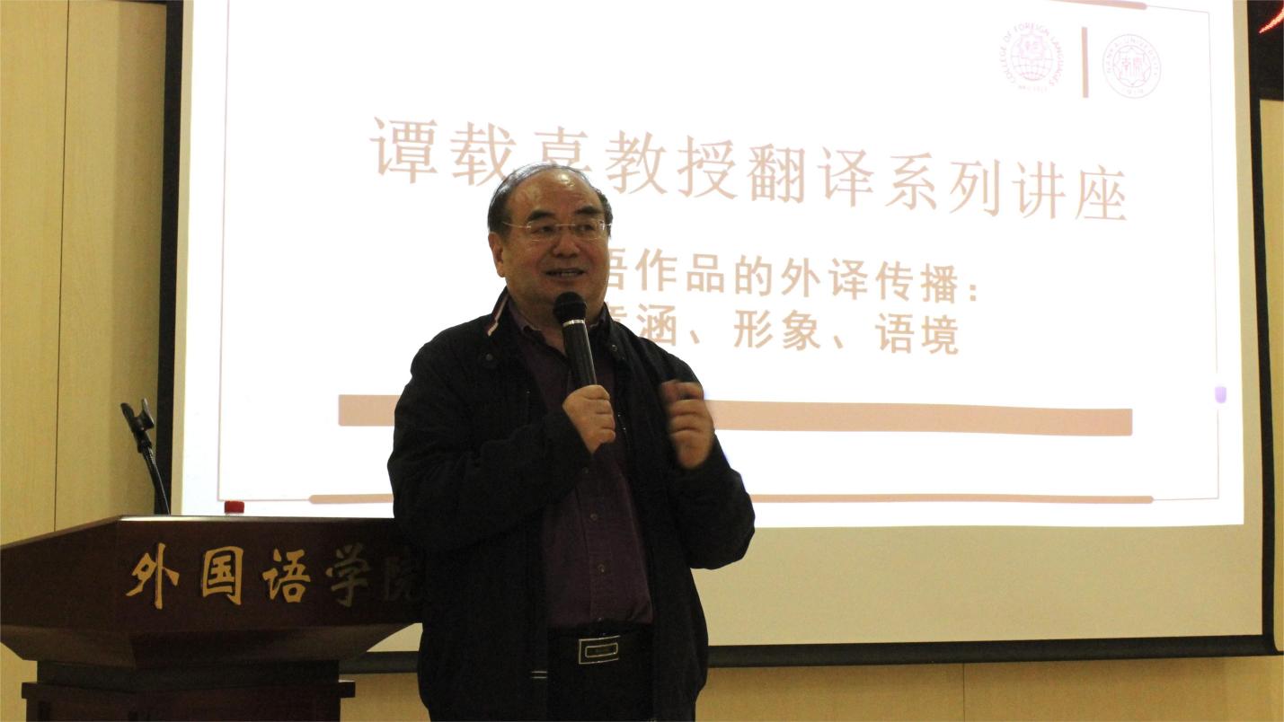4月10日下午,谭载喜教授带来以“母语作品的外译传播:意涵、形象、语境”为题的另一讲座。该讲座由翻译系胡翠娥教授主持。谭载喜以中国文化走出去战略为讲座背景,以全球化变局下如何做好母语作品外译传播话题为主轴,围绕这一话题涵盖的重要内容展开理论思考和讨论。他指出,我们既要重视内部研究,从文本出发,思考“译出母语/外译传播的语言及文化政治意涵”,也要兼顾国家需求,关注“外译传播与民族形象构建的内在关系”、“中国语境下机构外译传播的行为特质”等关键命题,以助力新形势下母语作品对外翻译传播及相关研究工作的发展。