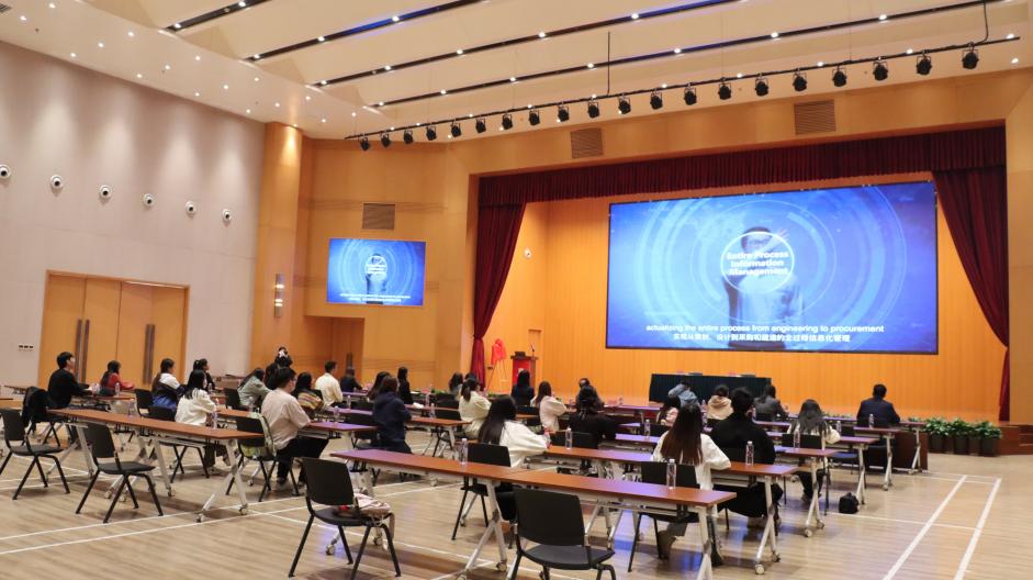 参观结束后,企业人员带领师生一行来到多功能厅,共同观看了中建钢构海外建设宣传片。同行师生对企业的海外发展现状有了进一步了解。
