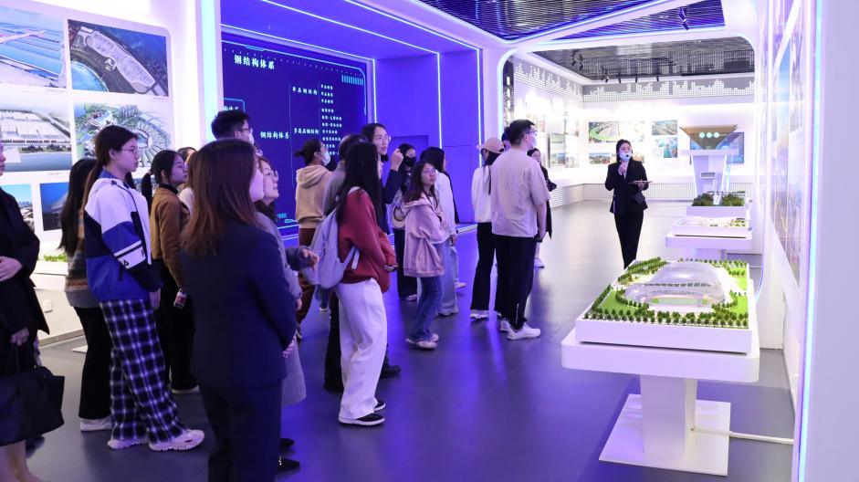 活动伊始,外院师生来到中建钢构陈列室,认真倾听讲解员的介绍,并观看了系列短片,对中建钢构的企业发展历程、资质荣誉和市场布局等有了初步了解。作为国内领先的钢结构建筑企业,中建钢构一直致力于推动建筑行业的创新与发展。从高楼大厦到桥梁隧道,从体育场馆到会展中心,中建钢构的足迹遍布全国各地,展现了其在建筑领域的广泛实力和卓越品质。