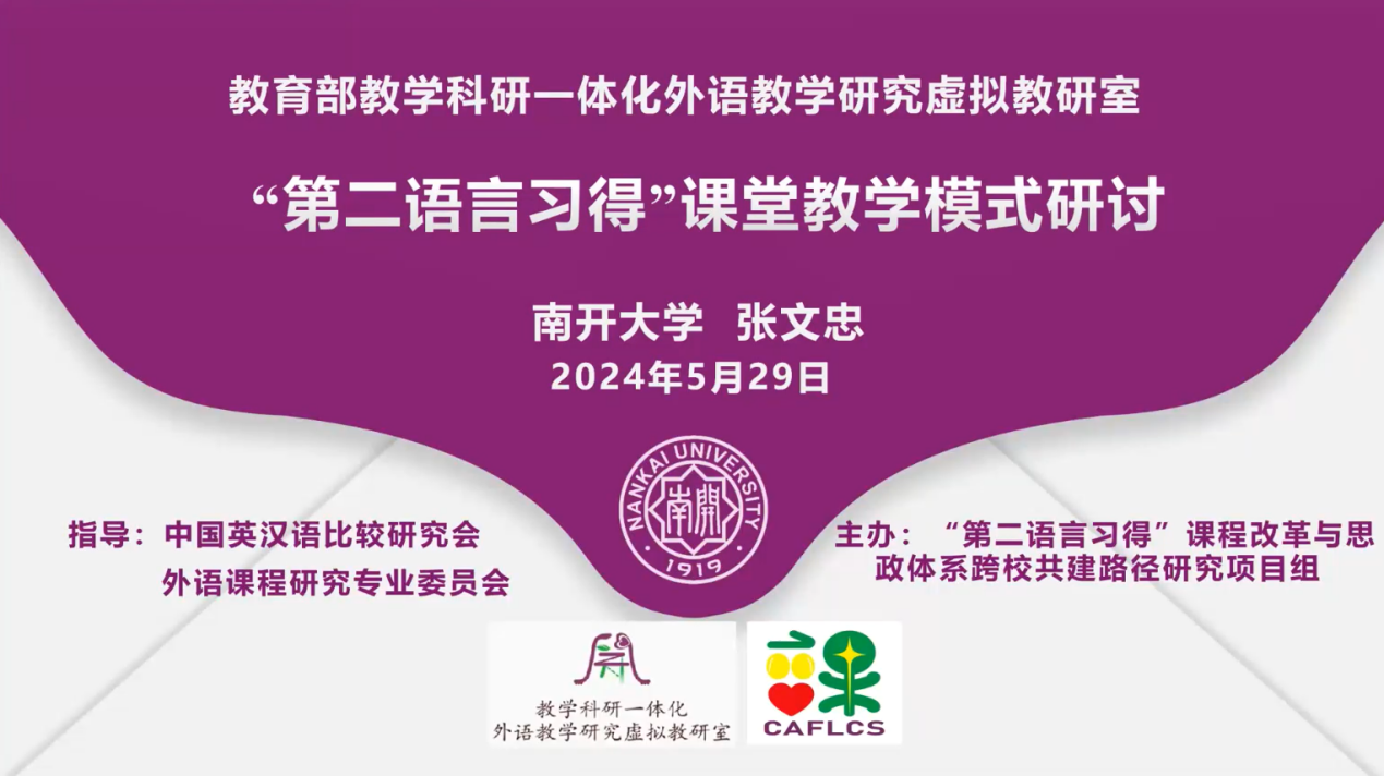 (通讯员 王冬焱)依托教育部教学科研一体化外语教学研究虚拟教研室,由2023年天津市高等学校研究生教育改革研究计划立项项目“‘第二语言习得’课程改革与思政体系跨校共建路径研究”教改项目组主办,中国英汉语比较研究会外语课程研究专业委员会、3044am永利集团外语教育与教师发展研究中心指导的“二语习得”课程教学模式与改革虚拟教研活动5月29日晚于钉钉平台成功开展。