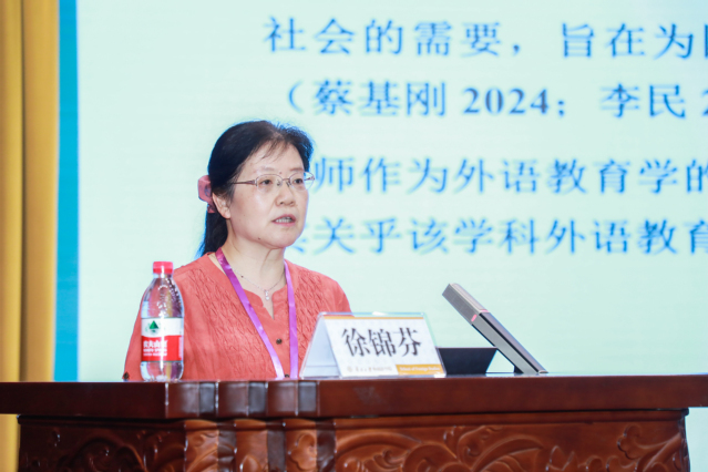 中国英汉语比较研究会二语习得研究专业委员会会长、华中科技大学徐锦芬教授做了题为“外语教育学中的教师语言综合素养”的报告。徐锦芬教授首先阐释了外语教师语言综合素养的内涵,具体包括语言知识、语言应用能力以及跨文化交际能力。她指出,当下外语教师存在语言技能发展不平衡、超语实践能力滞后以及学术读写能力不足的问题。基于此,徐锦芬教授从教师个体、教师专业发展培训以及教育联动成果评估等维度提出了针对性的建议。