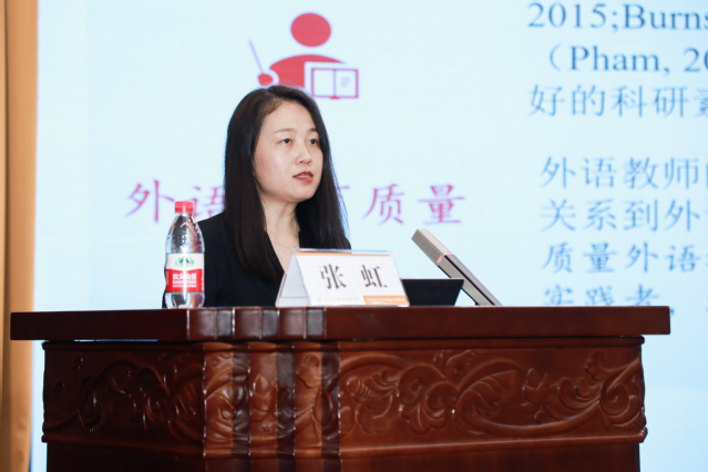 第八场讲座由北京外国语大学张虹教授主讲。张虹教授聚焦高校外语教师的科研素养,重点强调了外语教师的科研素养不仅影响教师个人专业发展,还直接关系到外语教育的质量和效果。张虹教授进而对高校外语教师科研素养的现状进行了分析,并从认知层面、方法层面以及环境层面提出了相应的对策。