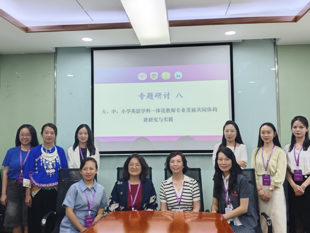 专题八聚焦大、中、小学英语学科一体化教师专业发展共同体构建研究与实践。昆明理工大学王英教授和昆明经开区实验小学的黄嵘教研员分别担任主持人和点评人。8位来自大学、中学以及小学的外语教师就教师专业发展展开了讨论。与会代表的发言为大、中、小英语教学一体化提供了新的思考。