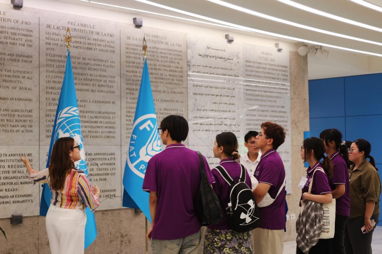 在工作人员的陪同和讲解下,师生们参观了由阿拉伯文、中文、英文、法文、俄文和西班牙文六大语种刻成的《联合国粮食及农业组织章程》和粮农组织图书馆。粮农组织图书馆藏书丰富,包括珍本、古籍和数字出版物,它的前身是1905年由意大利国王维托里奥•埃马努埃莱三世创立的国际农业研究所。目前,图书馆正在进行数字化转型,并向发展中国家提供技术支持。